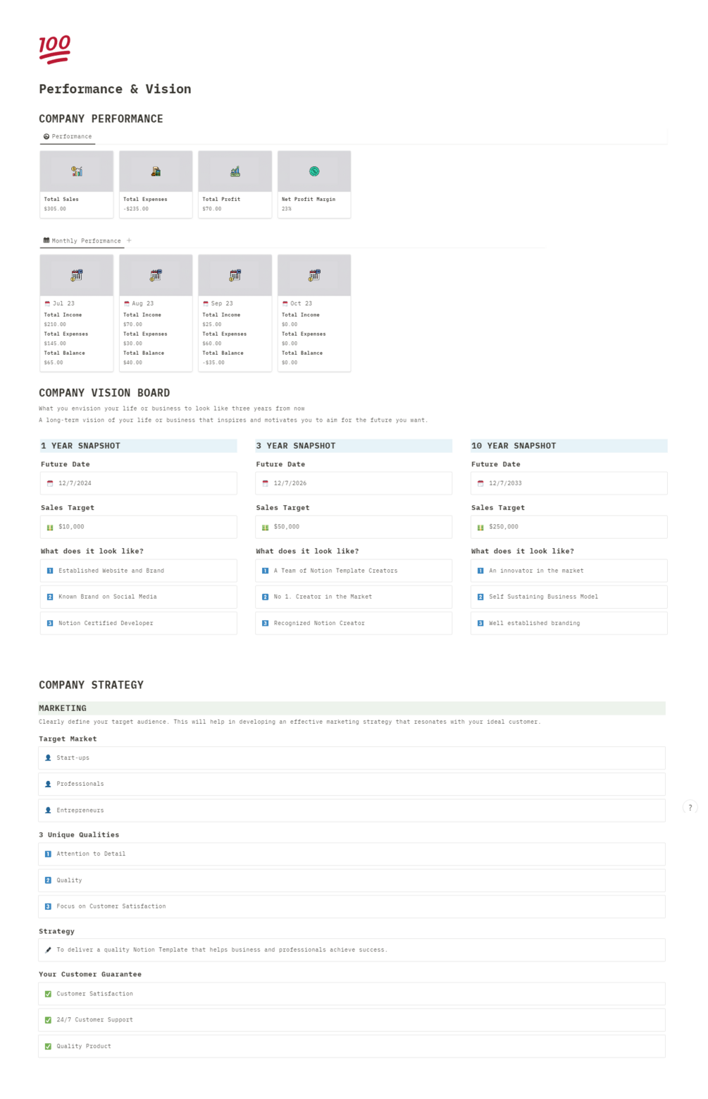 Unleash the power of data-driven decision making. Get a bird's-eye view of your company's performance with total sales, expenses, profit, and net profit margin neatly presented. Track your monthly performance to identify trends and make strategic adjustments. Fuel your ambition with a company vision board and craft a killer company strategy that sets you apart from the competition.