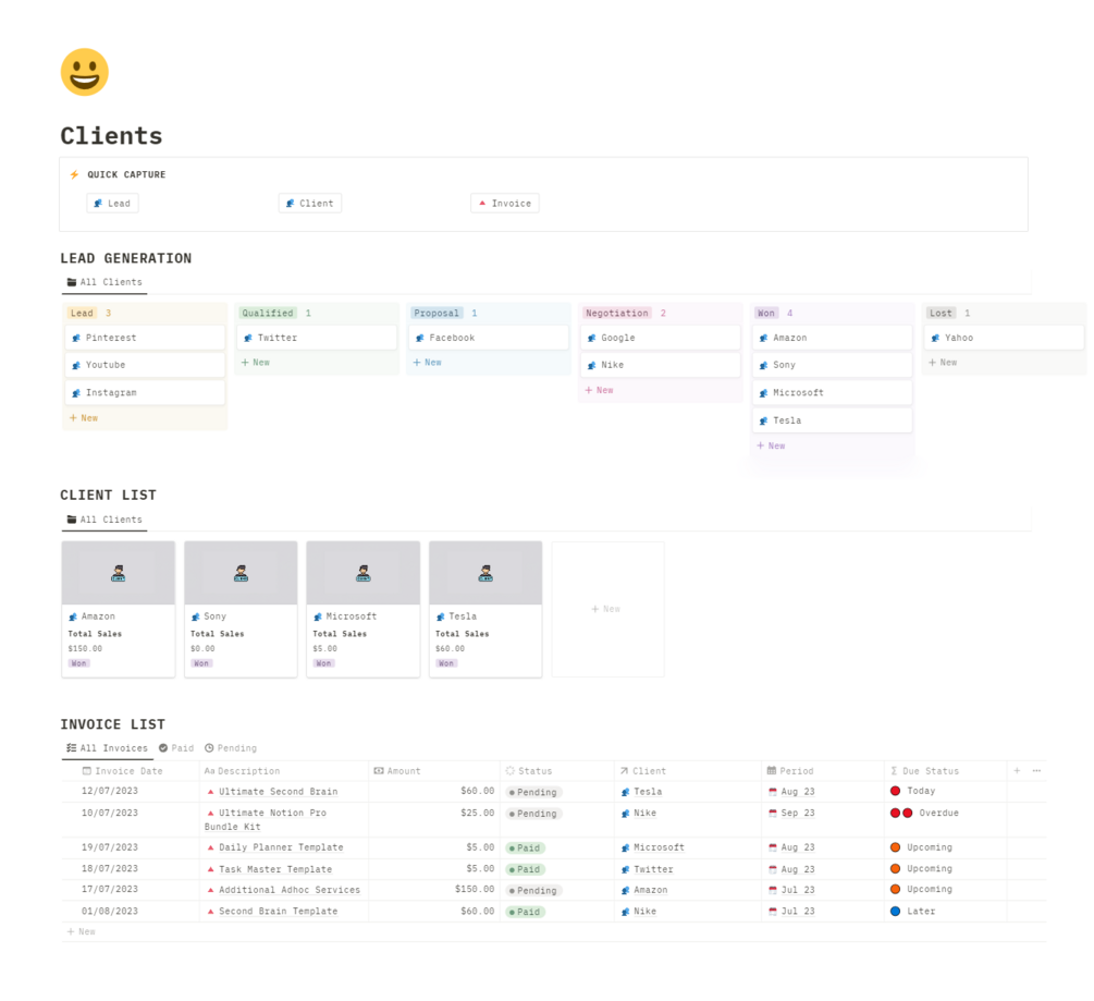 Generating leads and nurturing clients is a breeze with our intuitive lead generation process, client list, and client invoices list. Manage each Client effectively and effortlessly keep track of client invoices.